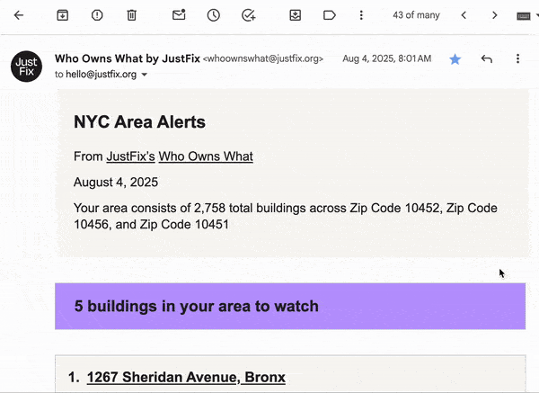NYC Area Alerts ↗ is a personalized weekly email to track housing trends and displacement risks across any NYC neighborhood or political district.